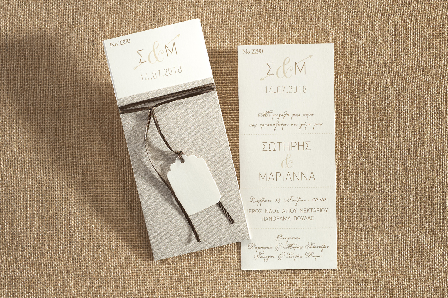 Προσκλητήριο Γάμου μακρόστενο με συρταρωτό φάκελο σε όμορφη απόχρωση, δεμένο με κορδελάκι και καρτελάκι. Στην πρόσκληση είναι σε σπασμένο λευκό.