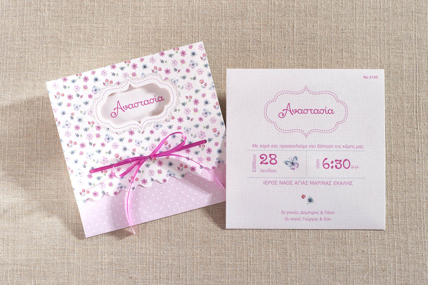 Προσκλητήριο βάπτισης με θέμα floral. Ο φάκελος είναι συρταρωτός.