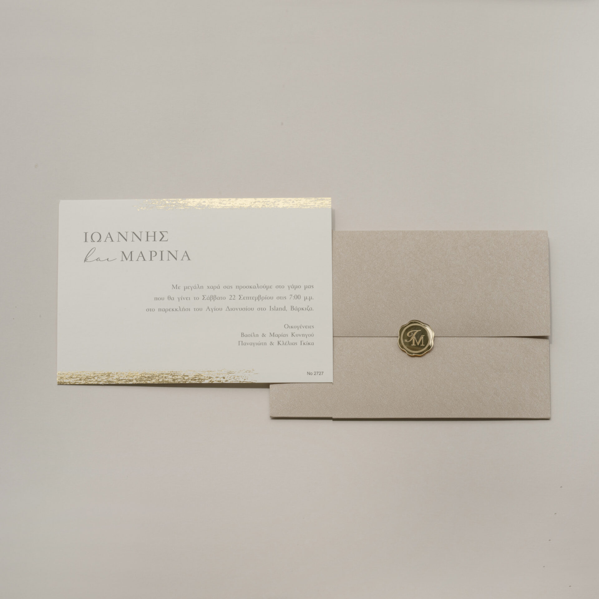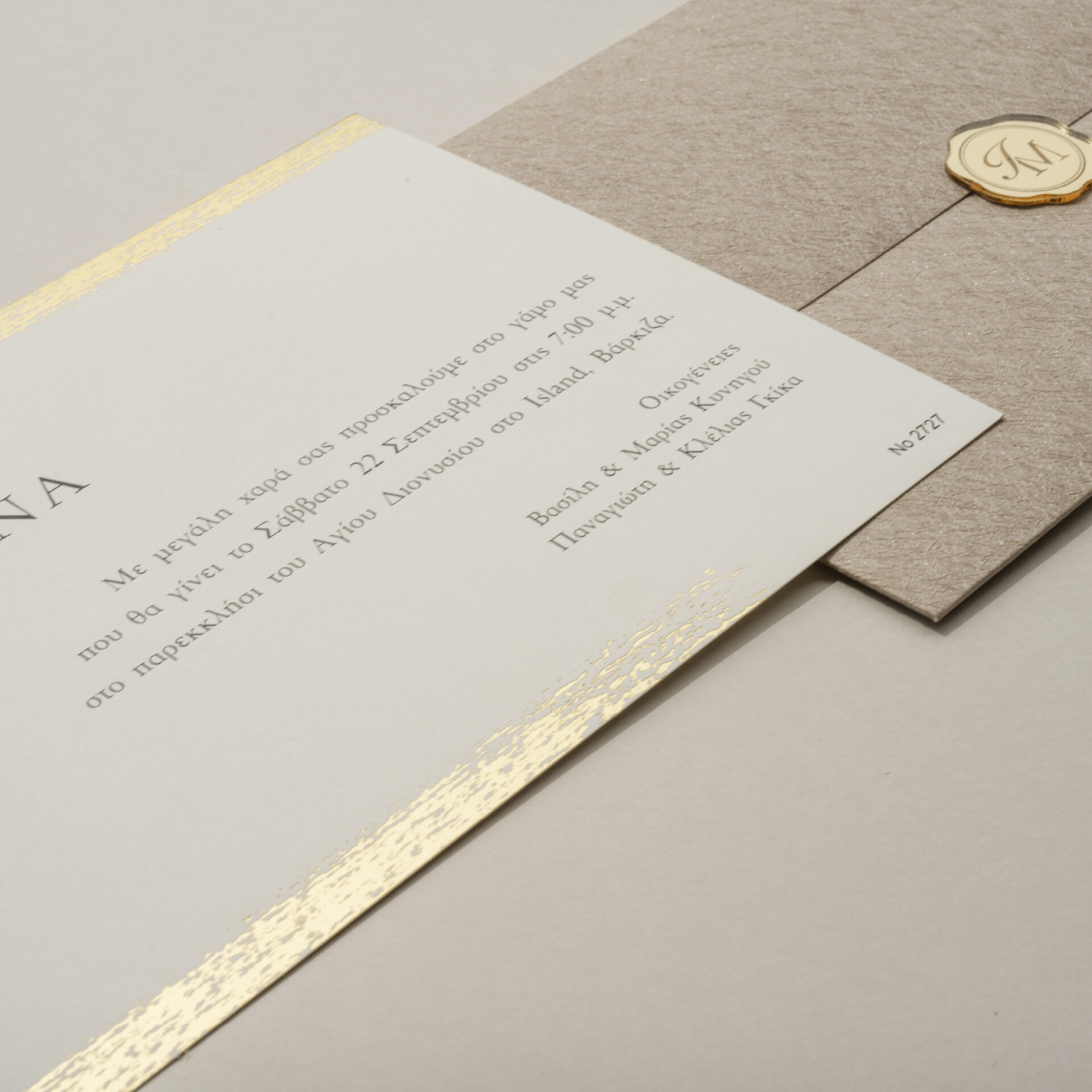 Προσκλητήριο γάμου σε ιβουάρ απόχρωση με χρυσοτυπία. Ο φάκελος είναι με ιδιαίτερη υφή και κλείνεται με χρυσό Plexiglass βουλοκέρι χαραγμένο με τα μονογράμματα σας.
