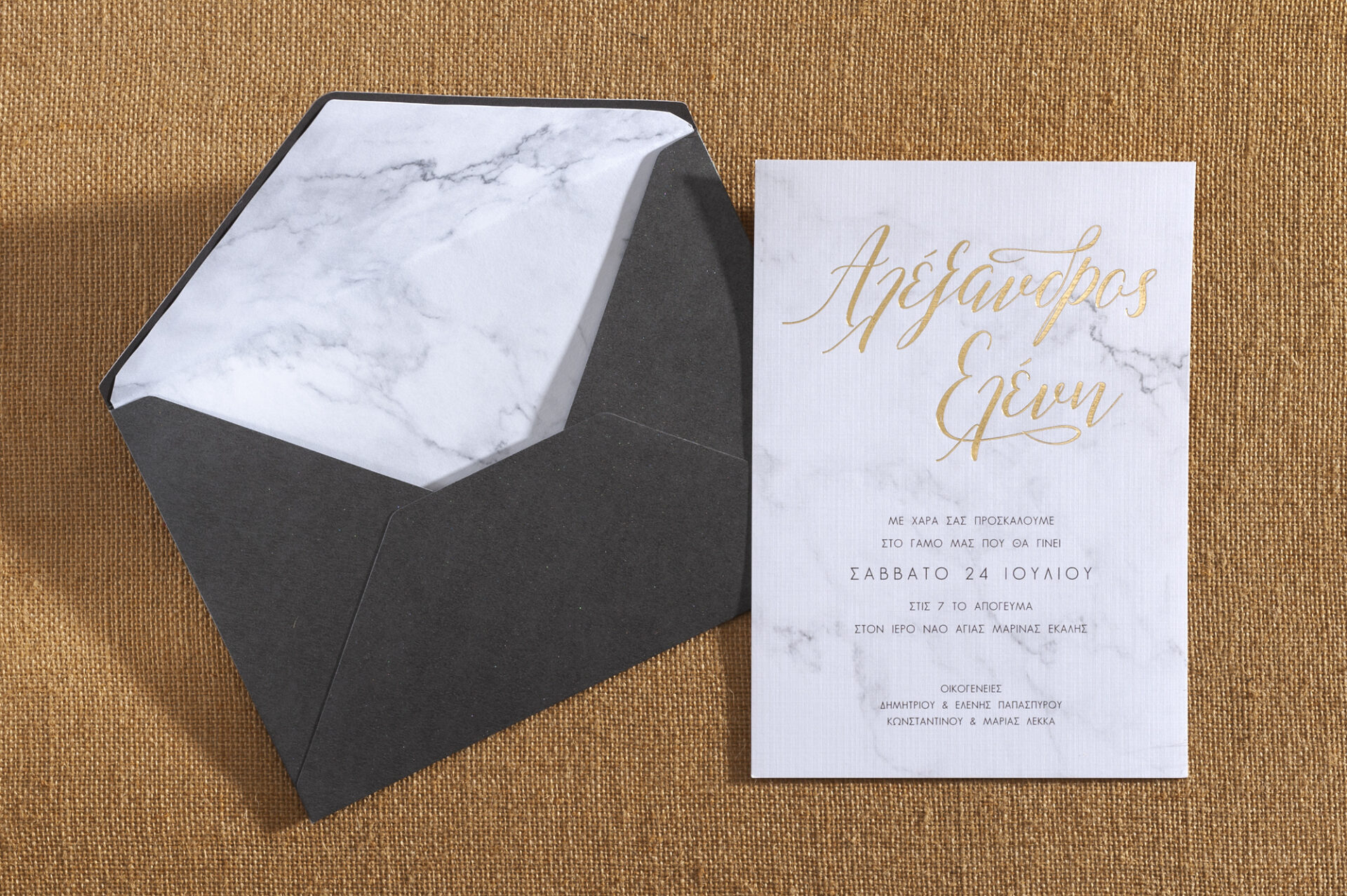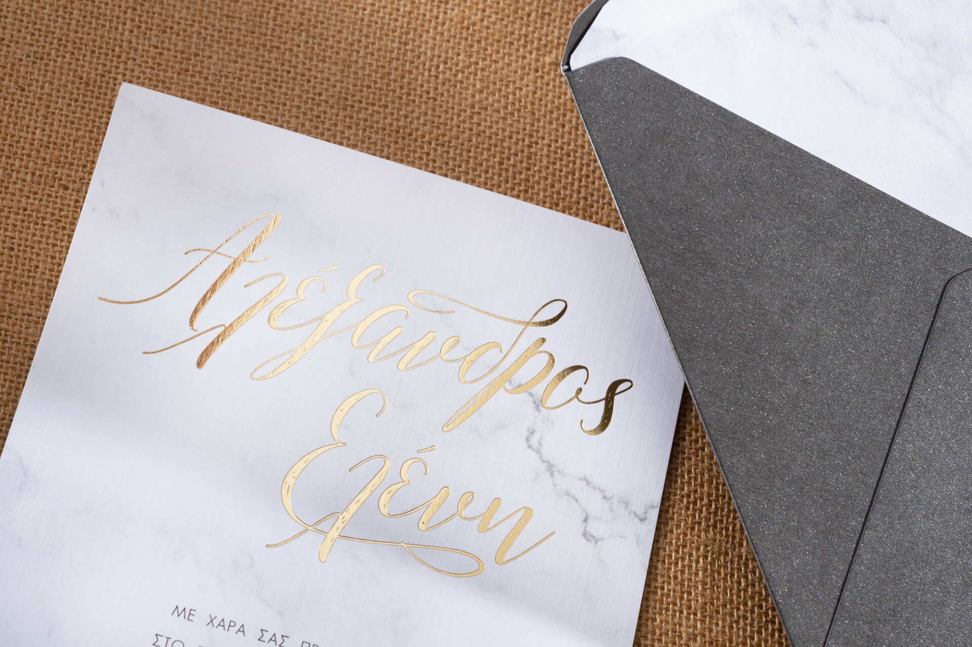 Προσκλητήριο Γάμου με γκρι μεταλλιζέ φάκελο φοδραρισμένο με εκτυπωμένο χαρτί απομίμηση μάρμαρου. Η πρόσκληση είναι με την ίδια εκτύπωση και χρυσοτυπία.
