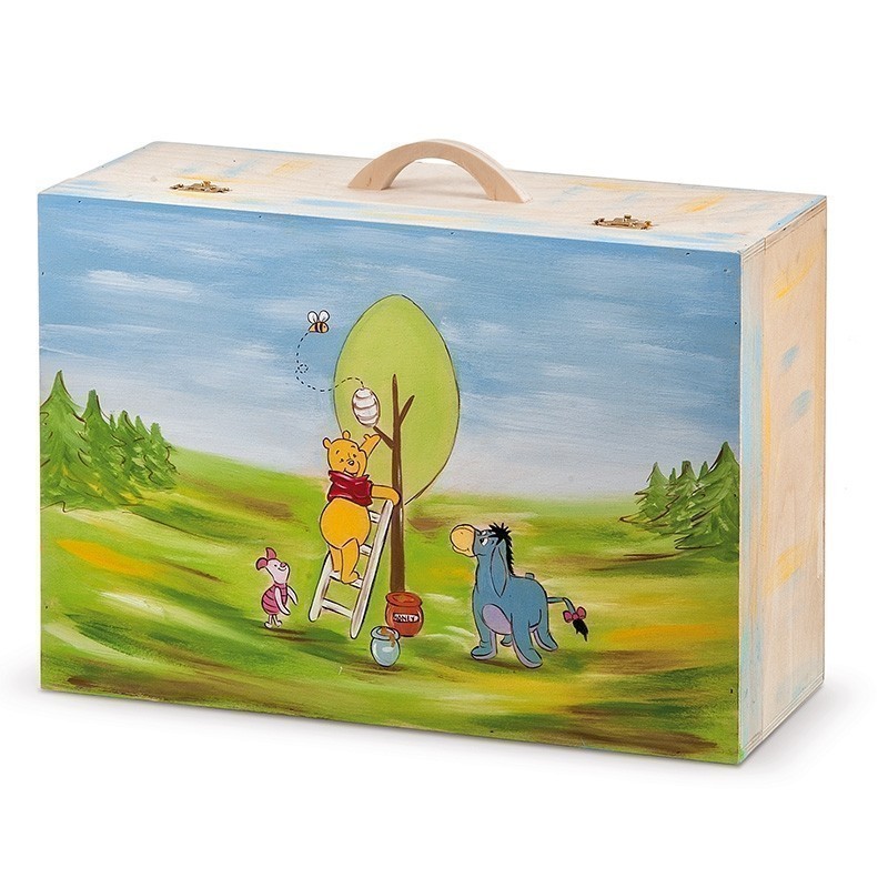 Disney ξύλινη natural βαλίτσα με χερούλι, συσκευασία βάπτισης ζωγραφισμένη στο χέρι με θέμα το αρκουδάκι Winnie the Pooh και την παρέα του να παίζουν μέσα στο καταπράσινο δάσος χαρούμενα. Η βαλίτσα γύρω γύρω έχει σβησίματα σε αποχρώσεις σιέλ-κίτρινες