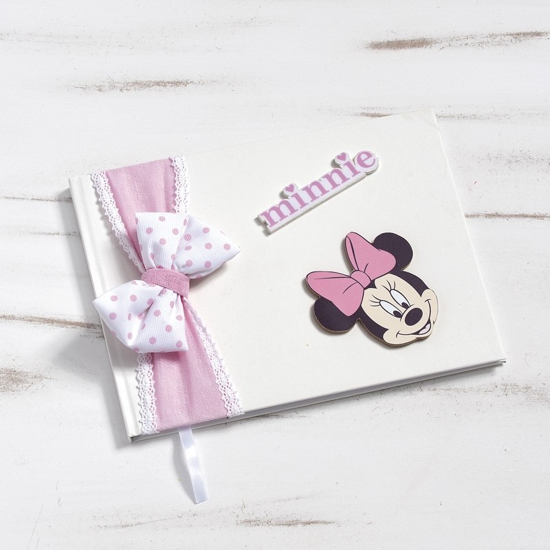 Disney λευκό βιβλίο ευχών εξωτερικά από χοντρό χαρτόνι δεμένο με φιόγκο από πουά ροζ λινό ύφασμα και διακοσμημένο με μικρή ξύλινη φιγούρα με το προσωπάκι της minnie και ξύλινη ταμπελίτσα πάνω στην οποία αναγράφεται το όνομα της minnie.
