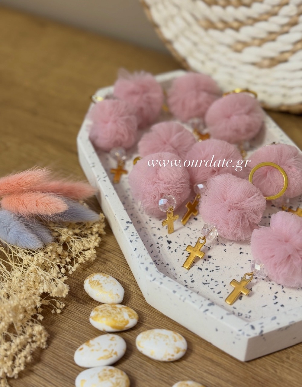 • Στολισμένα με πον-πον σε σάπιο μήλο, διάφανη χάντρα και χρυσό σταυρουδάκι.