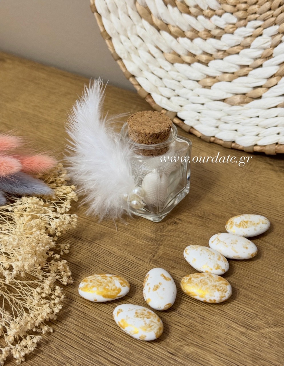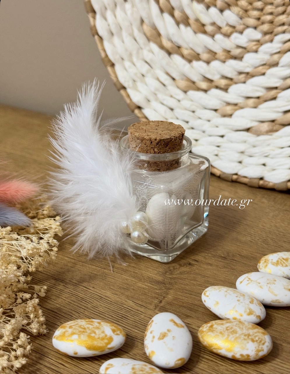 • Πολυτελής χειροποίητη μπομπονιέρα γυάλινο τετράγωνο βαζάκι 4 cm και ύψος 5,1 cm , στολισμένο με πούπουλο και πέρλα