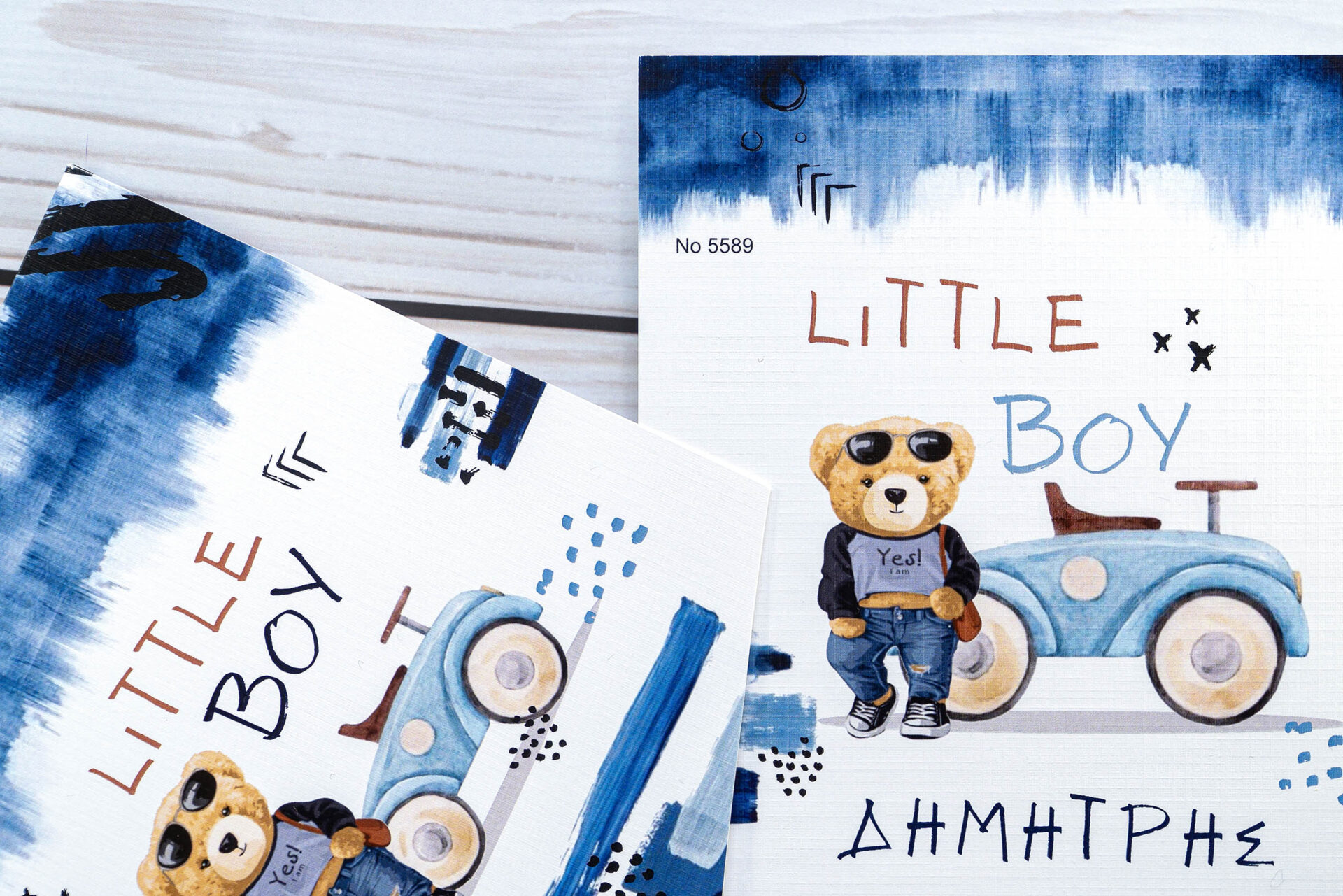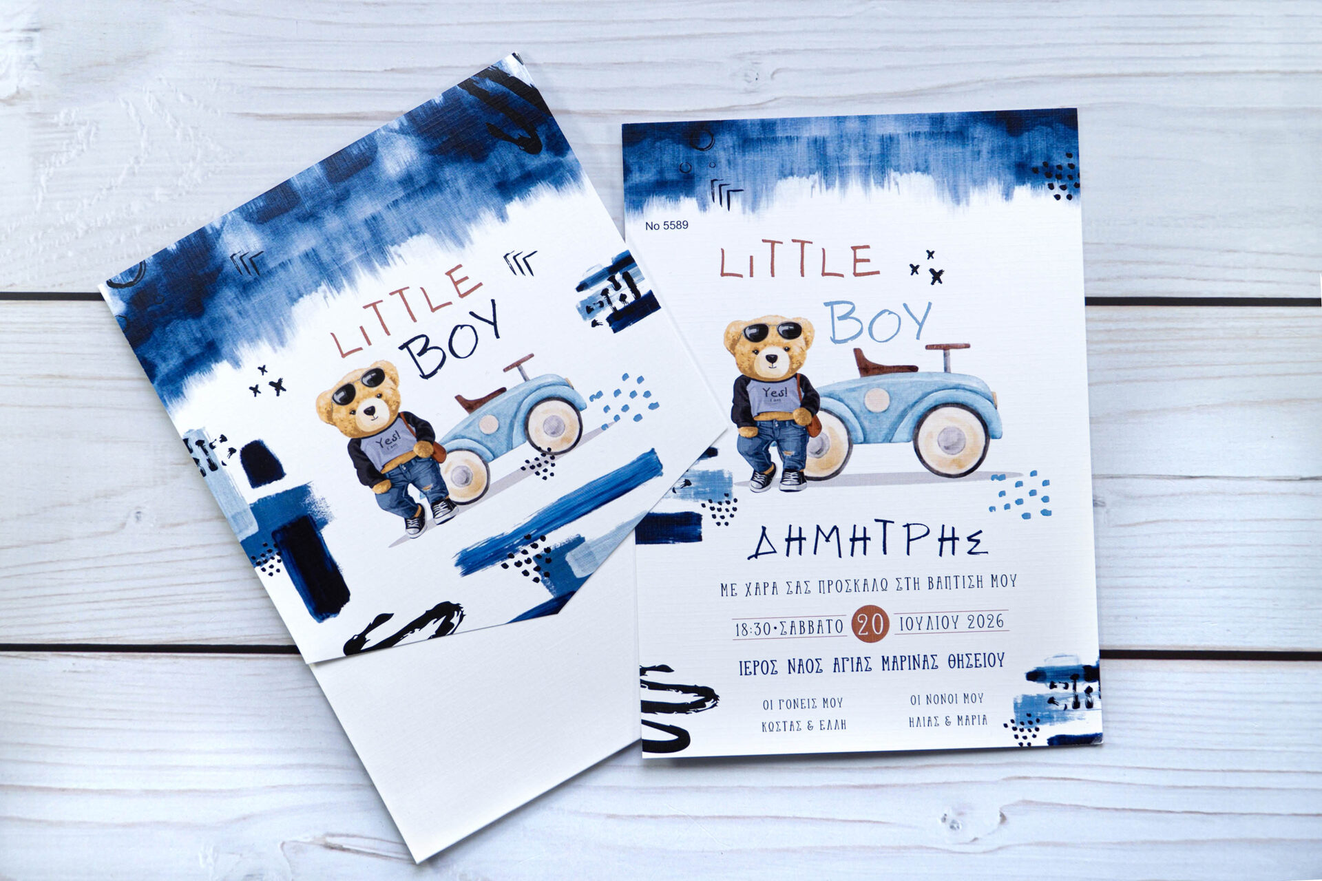 Προσκλητήριο βάπτισης με θέμα το αρκουδάκι και το αυτοκίνητο σε μπλε.