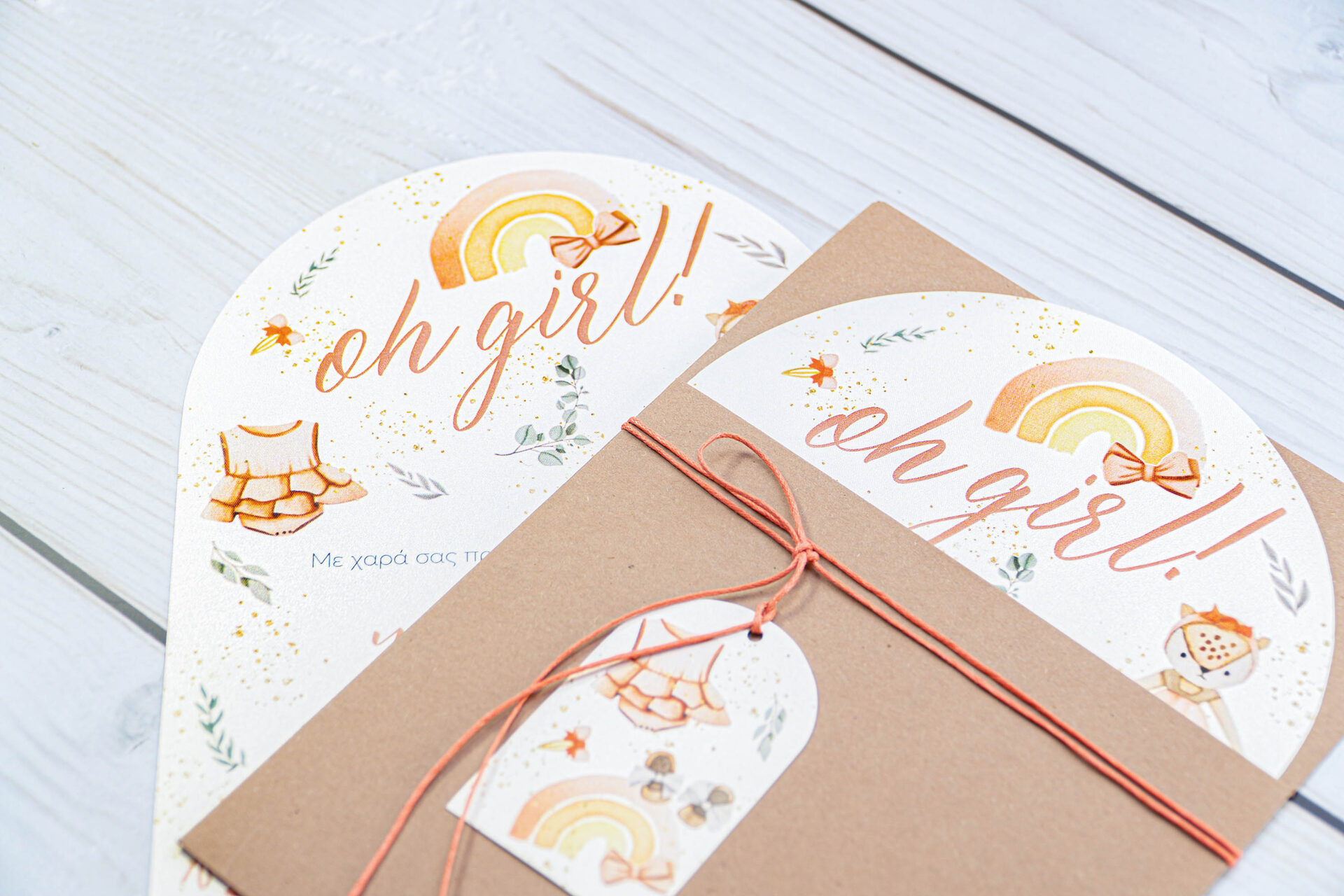 Η πρόσκληση έχει ιδιαίτερο κοπτικό και τα γραφικά είναι σε nude και πορτοκαλί αποχρώσεις.