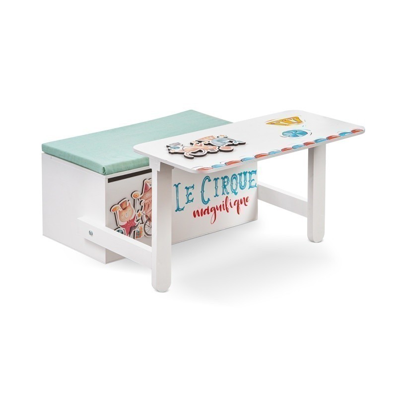 Ξύλινο κουτί βαπτιστικών παγκάκι-θρανίο με βεραμάν μαξιλάρι. Το κουτί είναι βαμμένο σε λευκό χρώμα. Στην πλάτη είναι ζωγραφισμένο το καπέλο του μάγου. Στο παγκάκι υπάρχουν δύο ξύλινες παραστάσεις με ζωάκια να κάνουν διάφορα ακροβατικά.