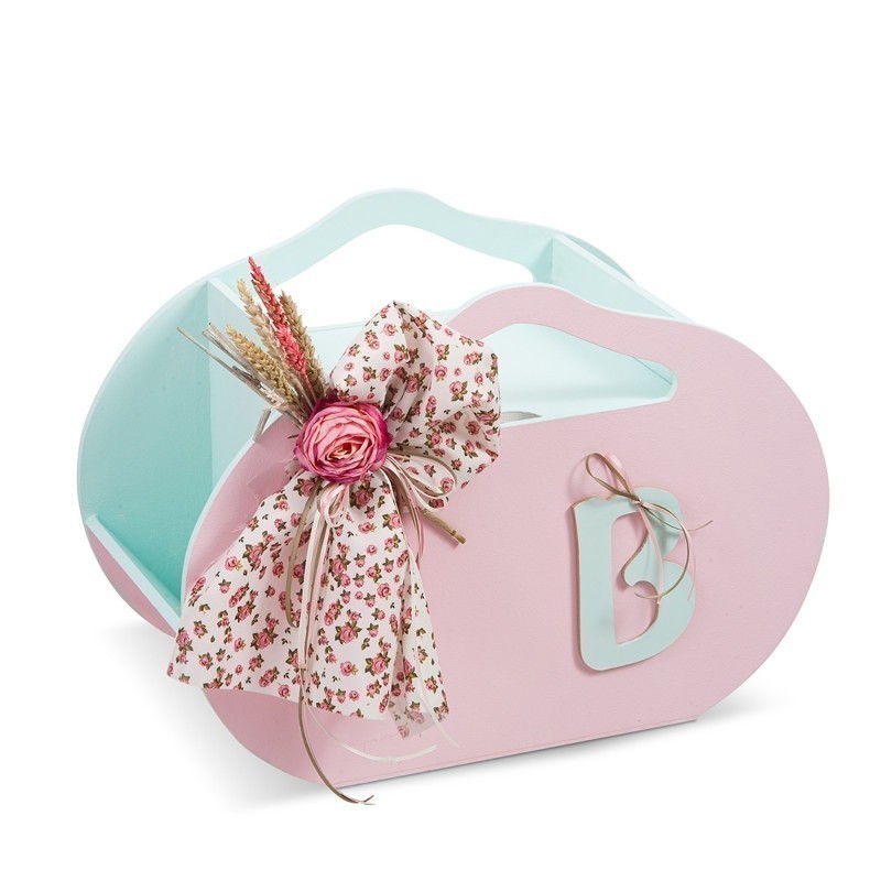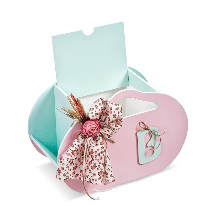 Ξύλινο κουτί βαπτιστικών τσάντα με θήκες. Η τσάντα είναι βαμμένη σε ροζ και βεραμάν χρώμα. Στο μπροστά μέρος είναι διακοσμημένη με floral ύφασμα, μπουκέτο από λουλούδια και ζωγραφιστό μονόγραμμα με το αρχικό του παιδιού.