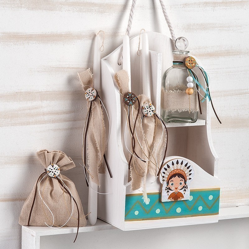 Λαμπάδα βάπτισης,δεμένη με κορδόνι λευκό και διακοσμημένη με ξύλινο βέλος,από το οποίο κρέμεται τελάρο κεντήματος από ξύλο και ύφασμα μπεζ.Πάνω στο ύφασμα υπάρχει ζωγραφιστή παράσταση με θέμα τη σκηνή του ινδιάνου με ethnic λεπτομέρειες, ενώ από το βέλος κρέμονται επίσης φτερά,κορδέλες και κορδόνια σε αποχρώσεις λευκές-μπεζ-καφέ και βεραμάν.