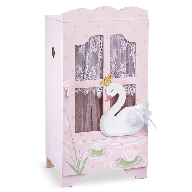 Ξύλινη natural βιτρίνα-ντουλαπίτσα με διακοσμητικό συρταράκι , συσκευασία βάπτισης ζωγραφισμένη στο χέρι με λιμνούλα γεμάτη νούφαρα και διακοσμημένη με ξύλινο λευκό κύκνο ο οποίος φαίνεται να κολυμπάει στη λιμνούλα. Την ντουλαπίτσα διακοσμεί επίσης κουρτινούλα από τούλι ροζ και δαντέλα λευκή.
