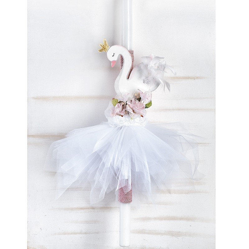 Λαμπάδα βάπτισης, ντυμένη με κορδόνι ροζ και διακοσμημένη με τούλι φουντωτό λευκό πάνω στο οποίο φαίνεται να στέκεται ένας κύκνος λευκός και κάτω από τον οποίο σχηματίζεται με δαντέλα ένα νούφαρο. Όλα σε αποχρώσεις λευκές-ροζ.
