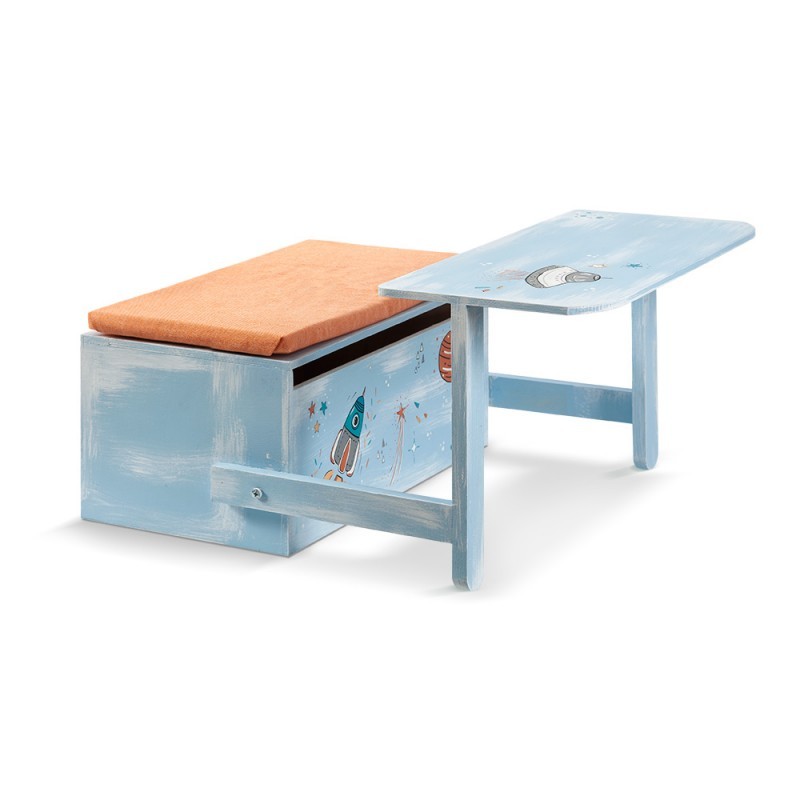 Ξύλινο κουτί βαπτιστικών παγκάκι που γίνεται θρανίο. Είναι σε brush σιέλ απόχρωση και απεικονίζει ζωγραφιστούς κομήτες, πλανήτες και πύραυλο.3,2,1..εκτοξευόμαστε. Στην πλάτη η φράση Ηouston we have a boy προϊδεάζει για την διαστημική χαρά σε μια από τις πιο ιδιαίτερες μέρες της ζωής σας, την βάπτιση του παιδιού σας.