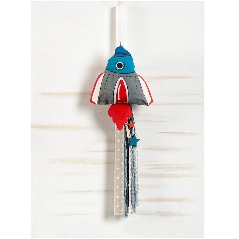 Η λαμπάδα είναι διακοσμημένη με πάνινο πύραυλο-διαστημόπλοιο σε γκρι, μπλε και κόκκινες αποχρώσεις. Η λαμπάδα είναι τυλιγμένη με ύφασμα σε μόκα-καφέ απόχρωση με λευκά αστεράκια. Στο πίσω μέρος κρέμονται υφασμάτινα κορδόνια σε διάφορους χρωματισμούς.