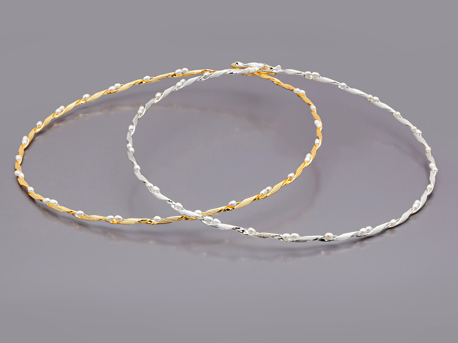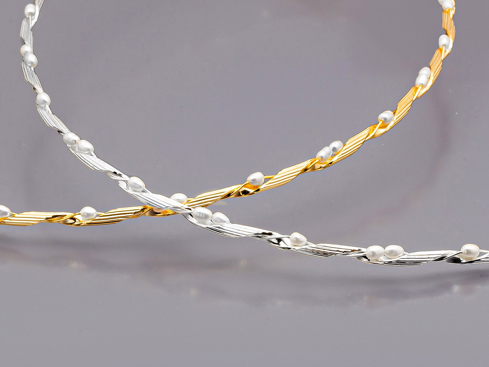 Χειροποίητα στέφανα γάμου επάργυρα ή ασημένια. Ιδιαίτερος κυλινδρικός γραμμωτός σκελετός συνδυάζεται με μαργαριτάρια.